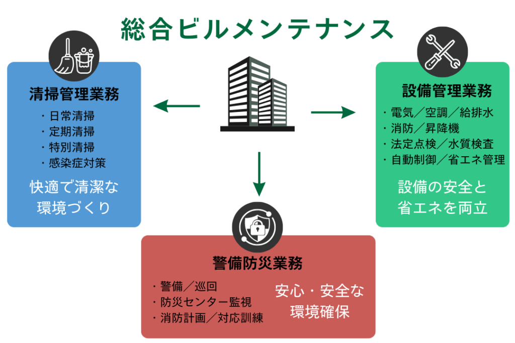 • 電気・空調・給排水・消防・昇降機など、各種設備の点検・整備