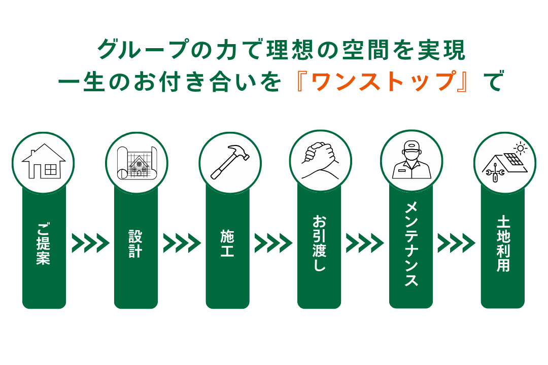 「ご提案」から「設計」「施工」、そして「お引渡し」後の「メンテナンス」や将来の「土地活用」まで、